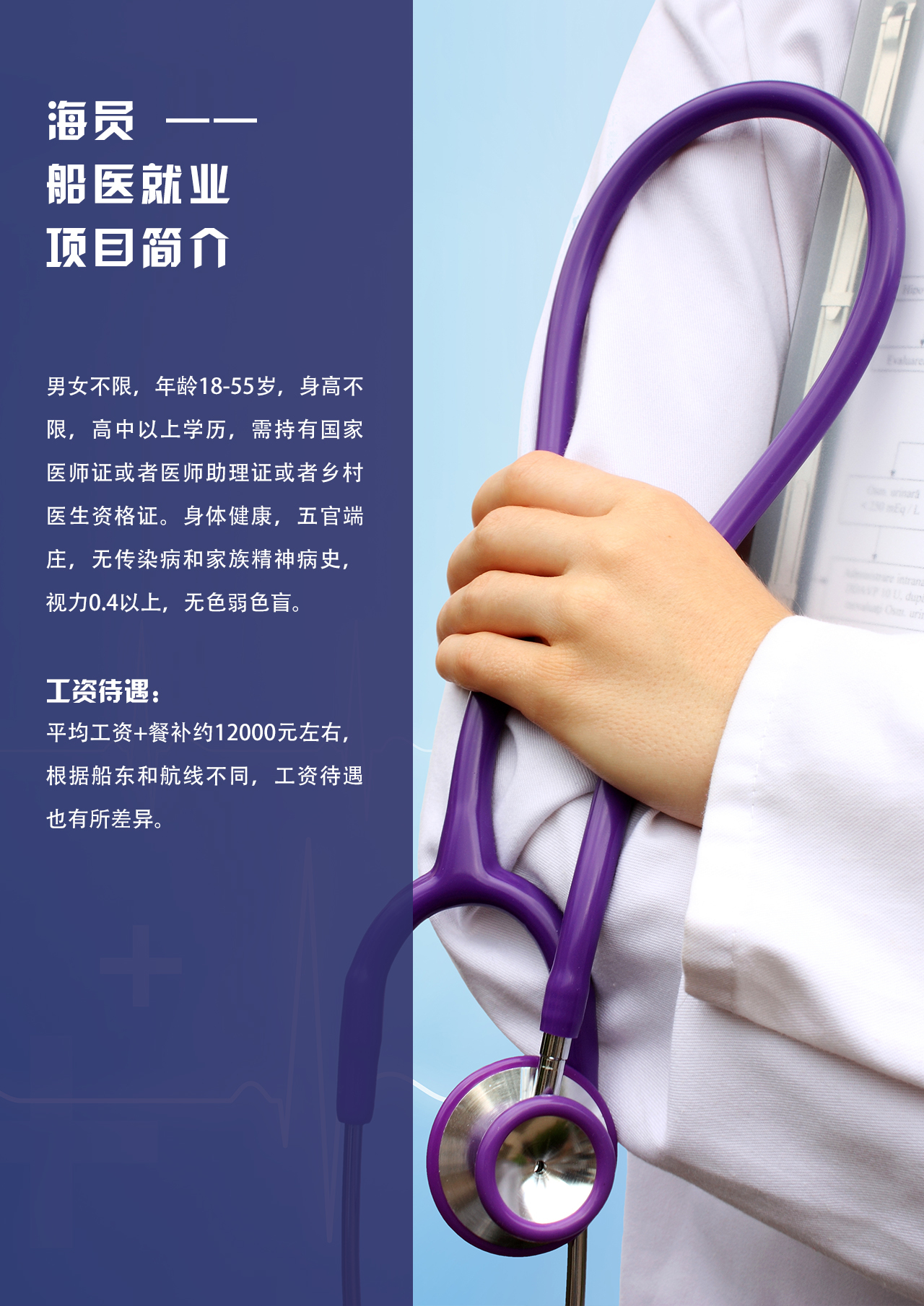男女不限,年龄18-55岁,身高不限,高中以上学历,需持有国家医师证或者医师助理证或者乡村医生资格证。身体健康,五官端庄,无传染病和家族精神病史,视力0.4以上,无色弱色盲。