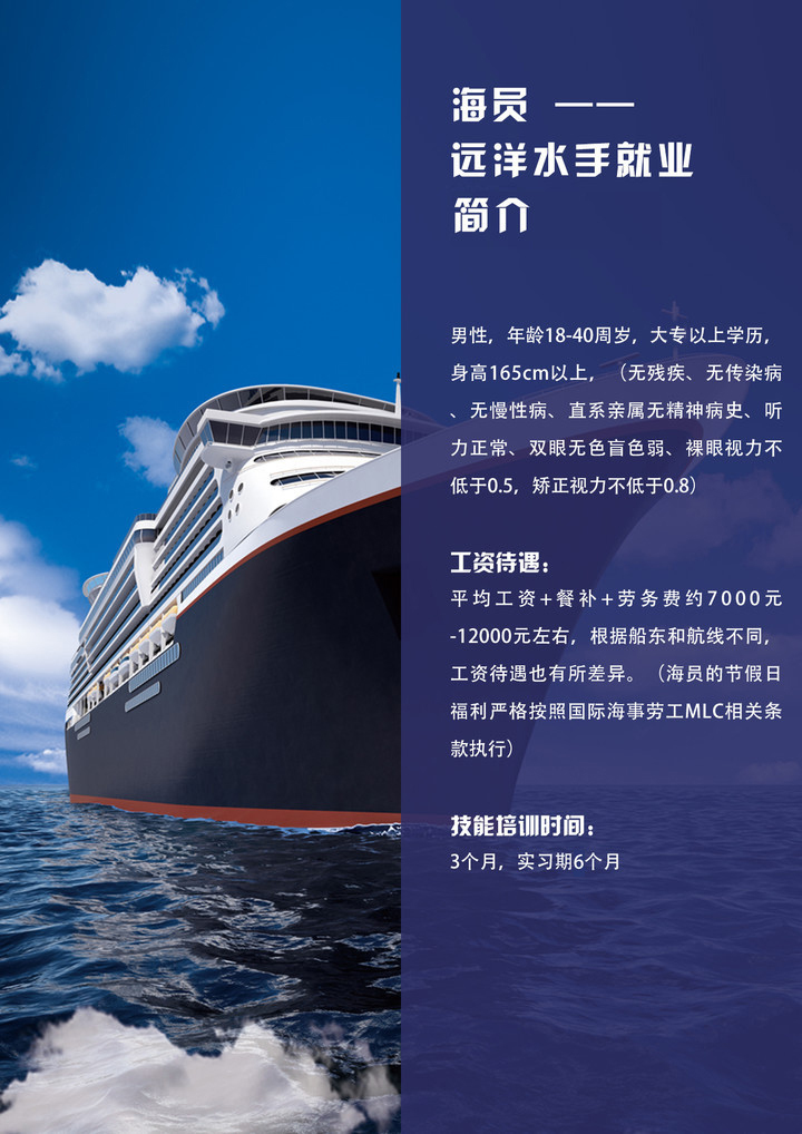 平均工资+餐补+劳务费约7000元-12000元左右,根据船东和航线不同,工资待遇也有所差异。(海员的节假日福利严格按照国际海事劳工MLC相关条款执行)